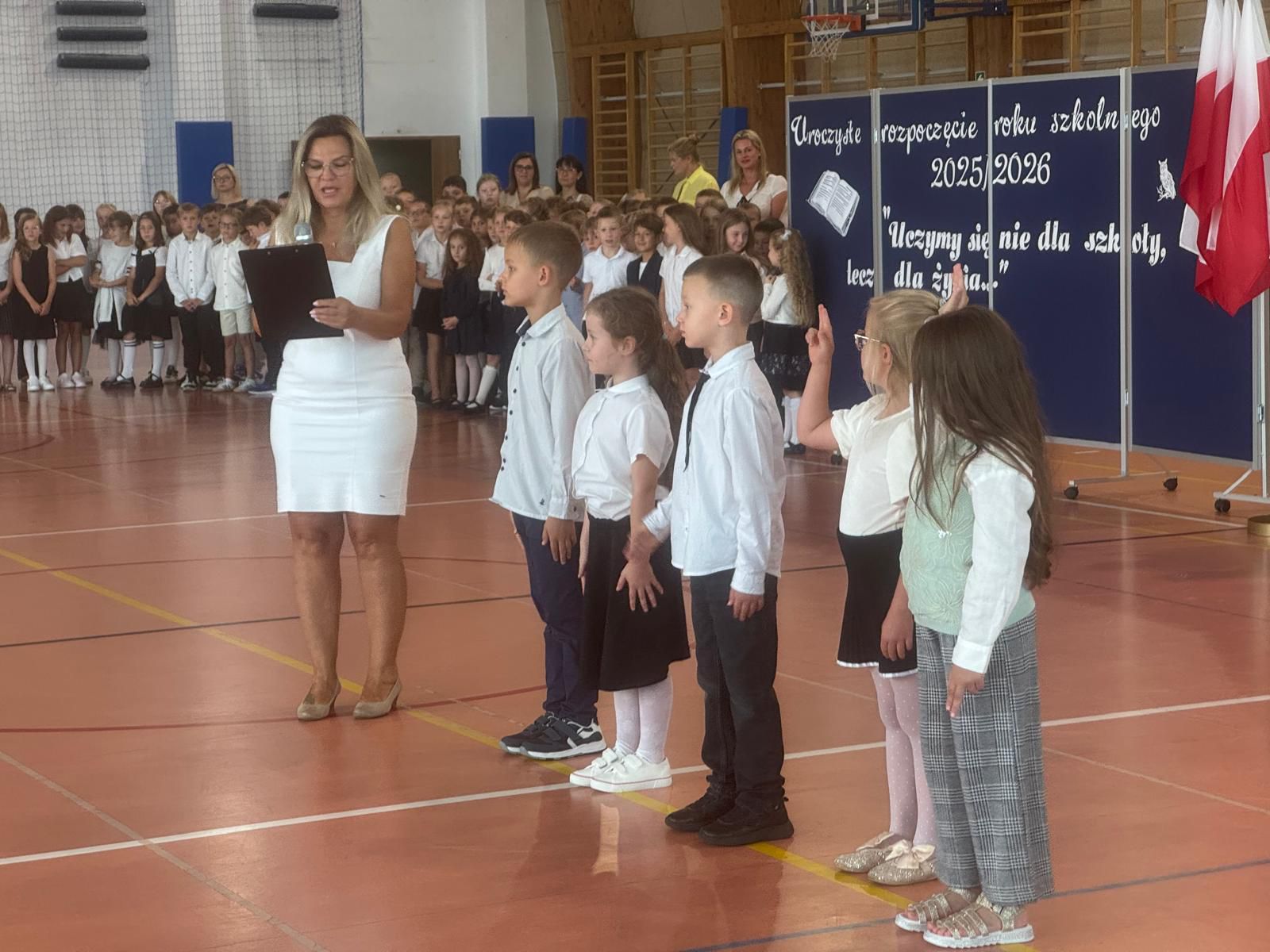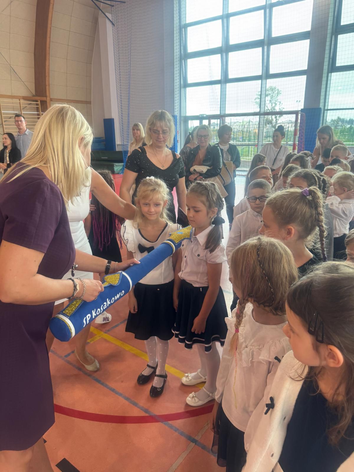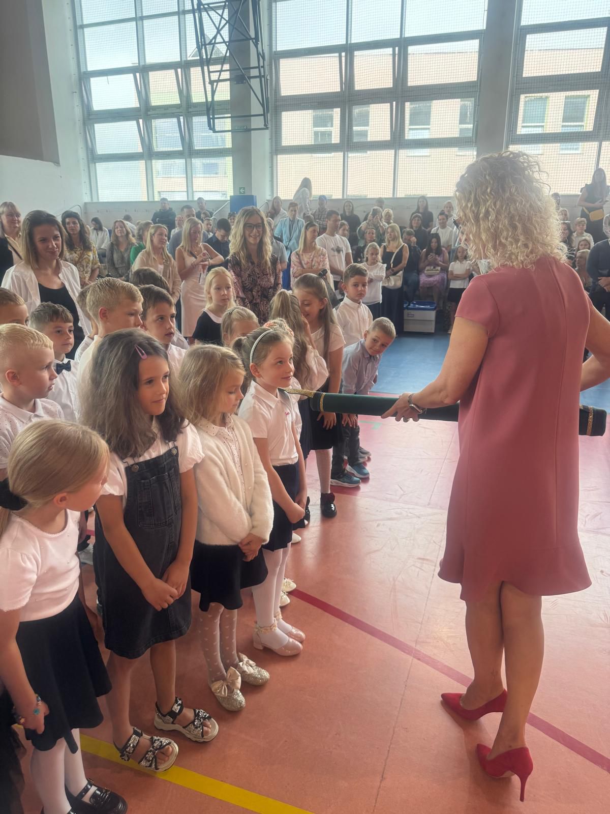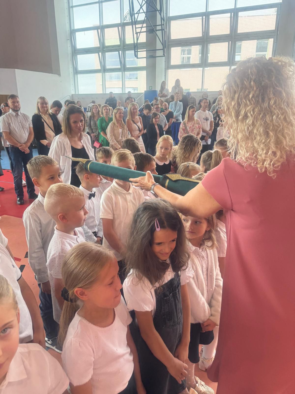 1 września w naszej szkole odbyła się inauguracja roku szkolnego 2025/2026 połączona z uroczystym pasowaniem pierwszoklasistów na uczniów. Swoją obecnością zaszczyciła nas Pełnomocnik ds. Oświaty oraz Sekretarz Gminy Kosakowo Pani Agnieszka Kamińska-Klimczyk, która w imieniu Pani Wójt przekazała upominki dla uczniów klas pierwszych. Pani Dyrektor życzyła uczniom, aby każdy dzień w szkole był dla nich interesujący, pełen radości i prosiła, aby pamiętali, że: „Uczą się nie dla szkoły, lecz dla życia”.